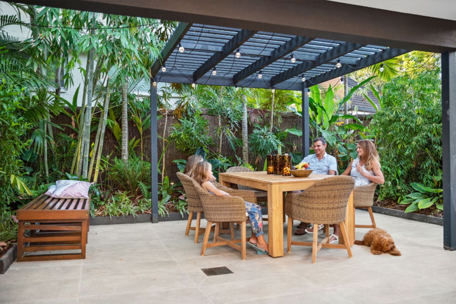 The sub-tropical exterior garden creates a temperate environment and with louvers throughout the home allows for refreshing natural airflow.