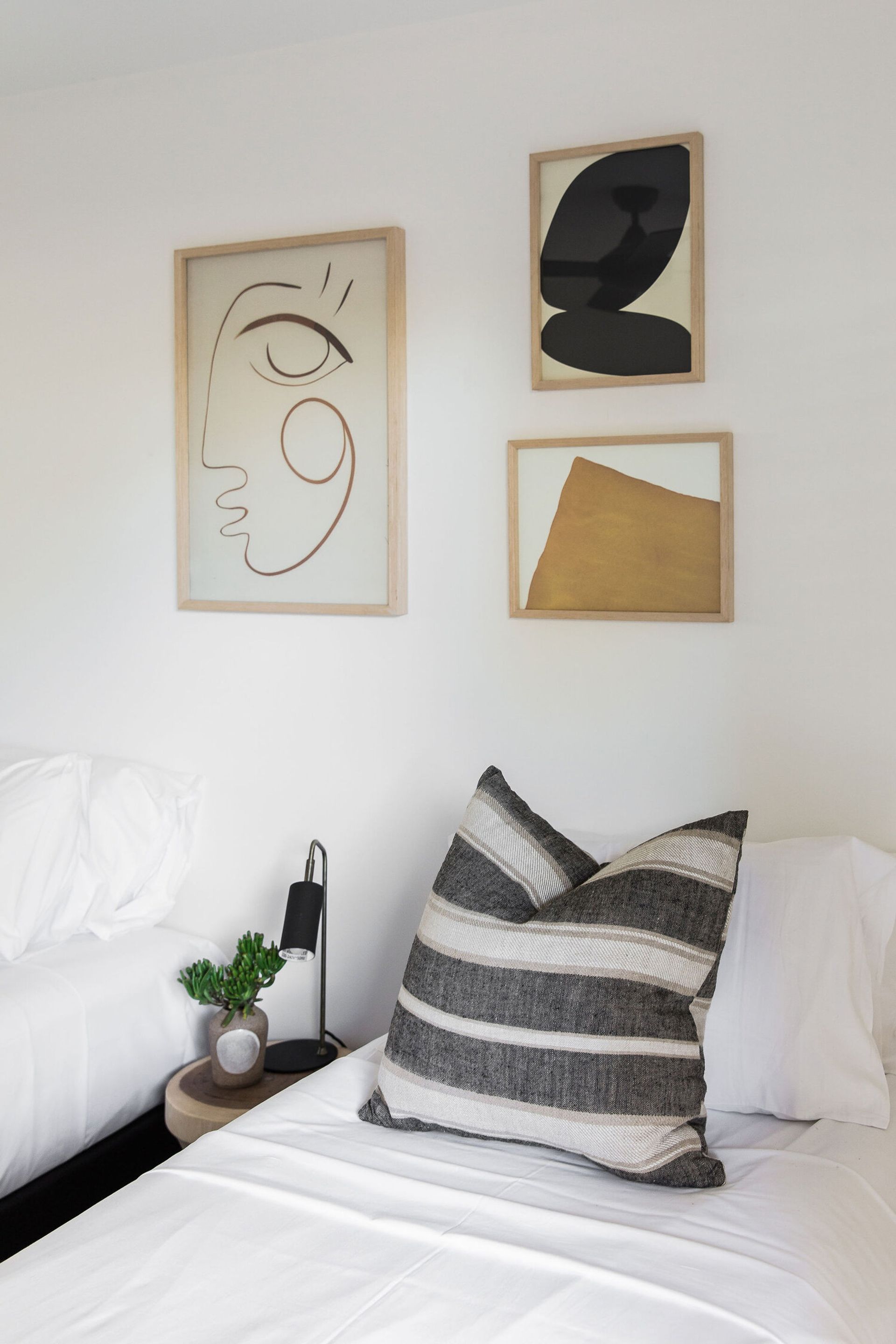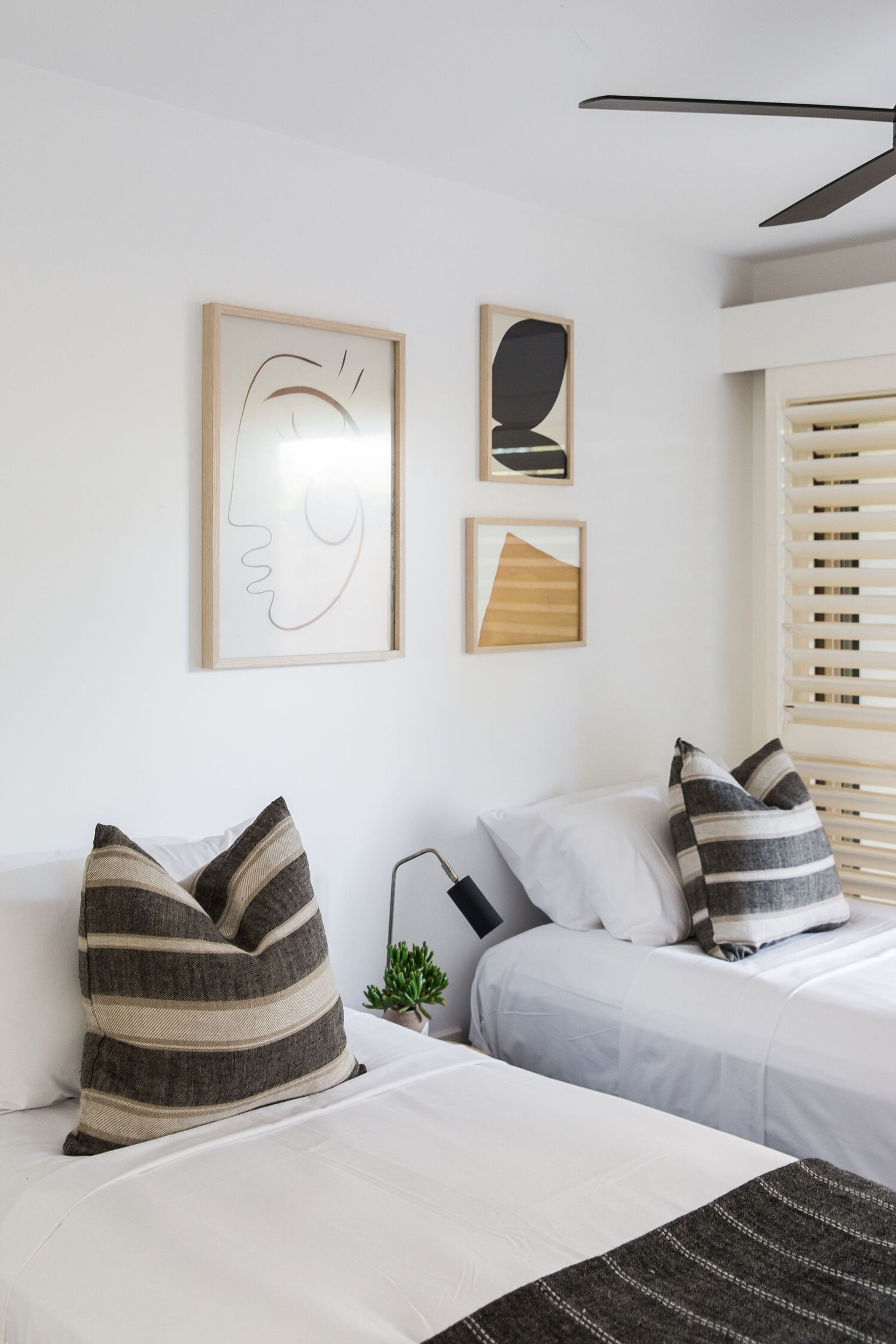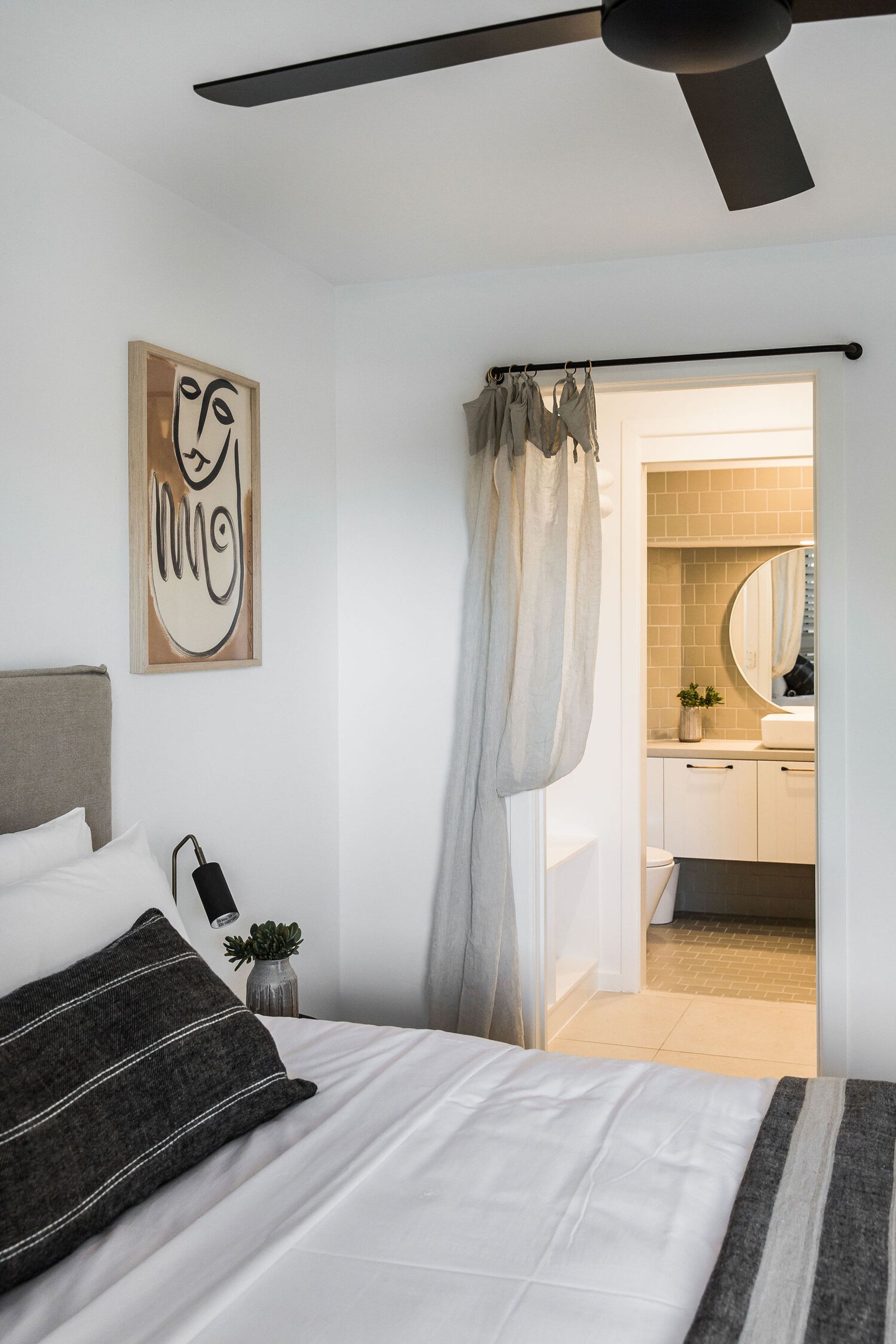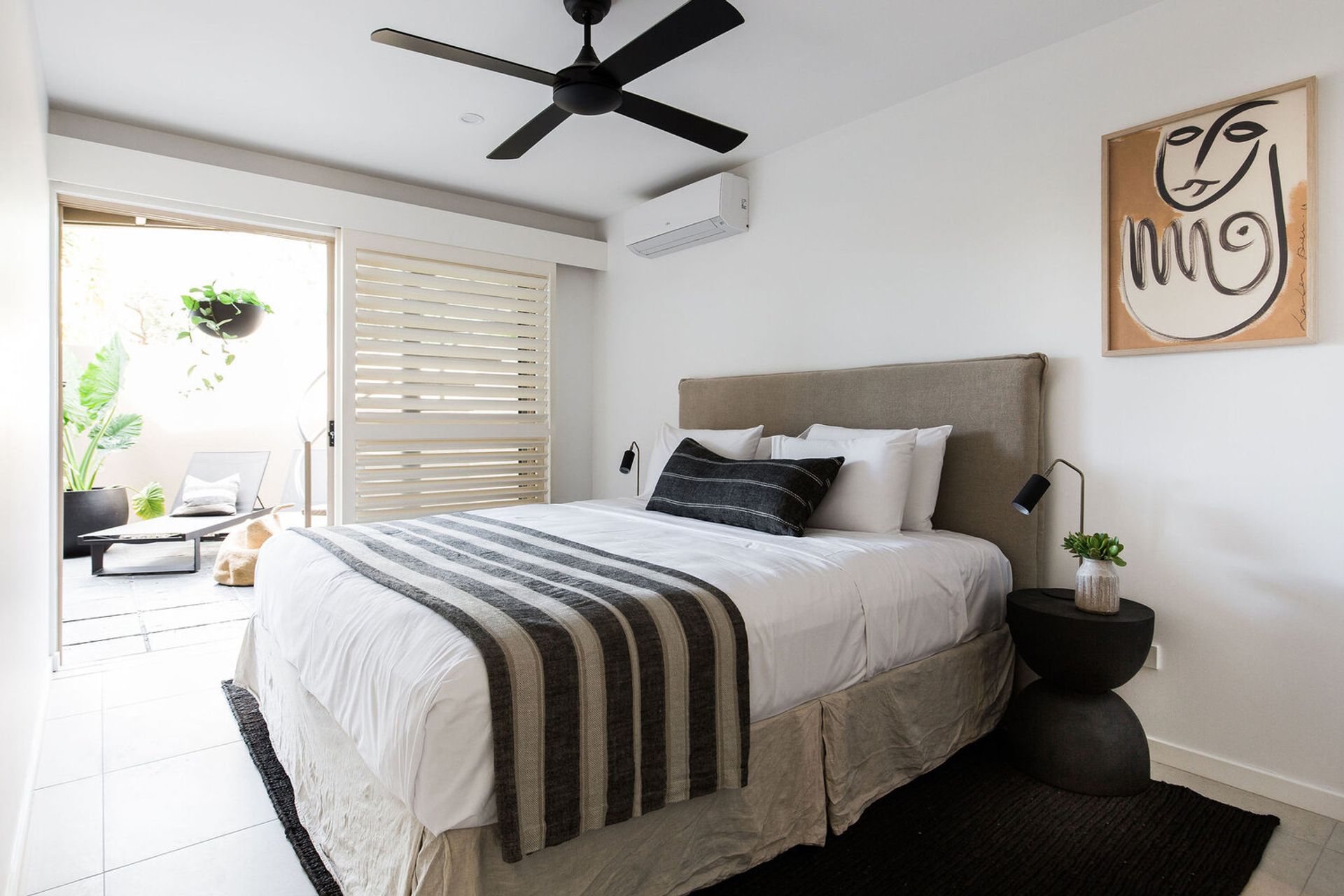 The two bedrooms have 5-star resort-style beds with luxurious bedding, and the master suite has a king-size bed and ensuite, with its own private courtyard encasing the Villa bedrooms downstairs. There are two bathrooms and a laundry.