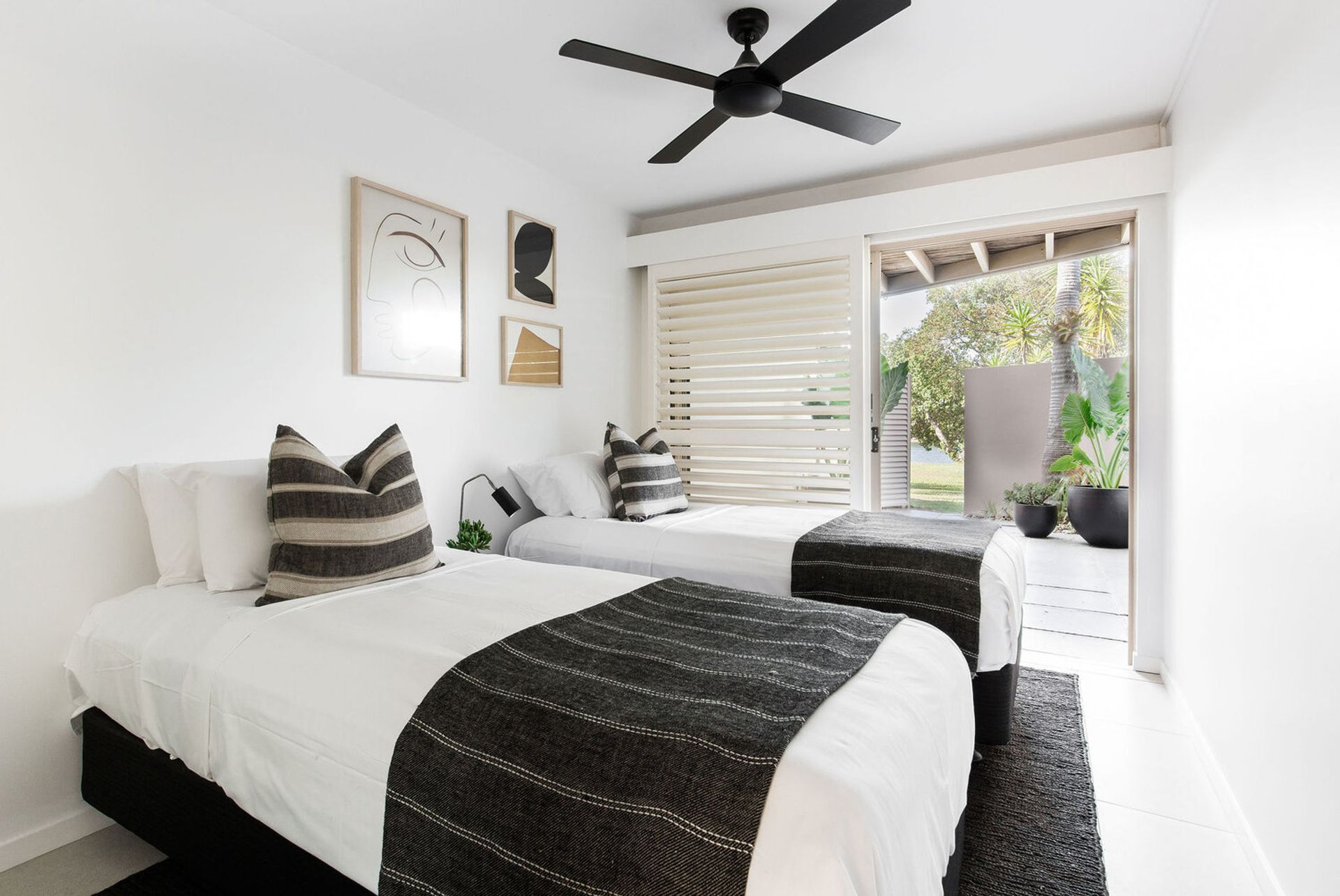 Located on the street end of the complex this 2 bedroom Villa has both bedrooms located on the ground floor, and both with direct access via sliding glass doors with plantation shutters to the ground floor private secured courtyard. The master bedroom has air-con and ceiling fan, the second bedroom has a ceiling fan. Both bedrooms have security screens to the courtyard that are lockable to allow a river breeze.