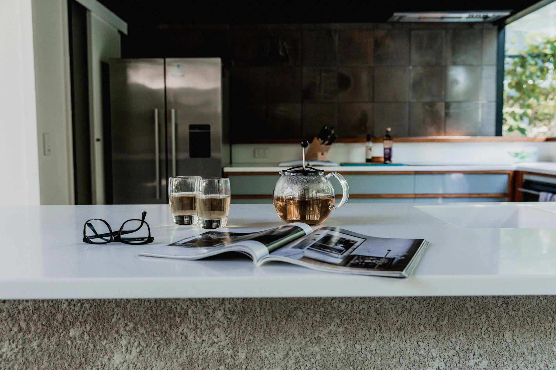 The kitchen and lounge room look out to the front outdoor garden on the beach side, and the indoor/outdoor dining room and pool on the inner side of the property. With large timber glass sliding doors that are ceiling height the house opens up to create one seamless living area. The pool and media room are separated from the outdoor dining and living area by glass pool fencing and garden.