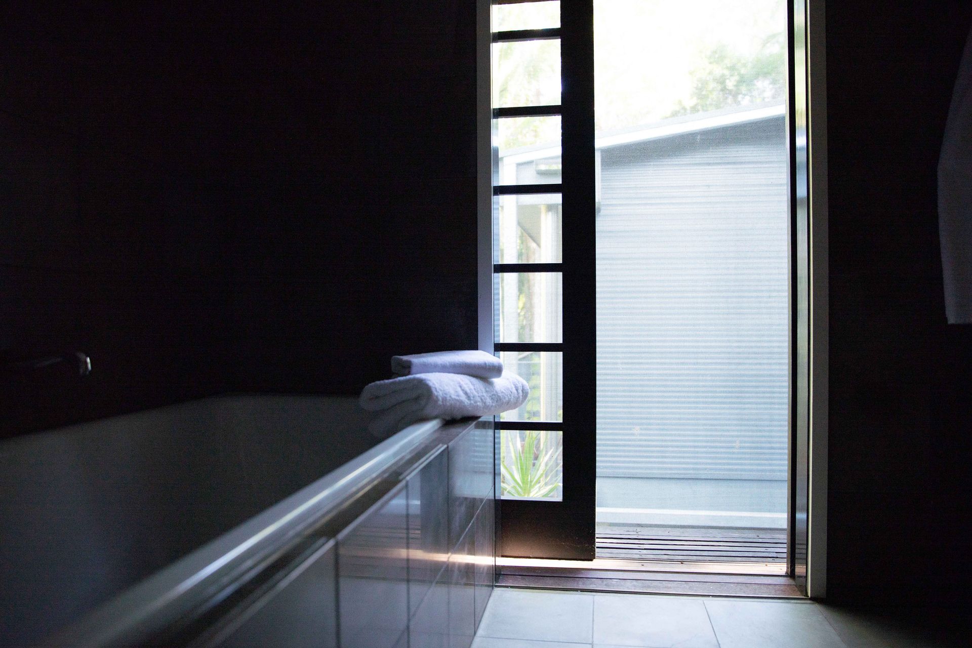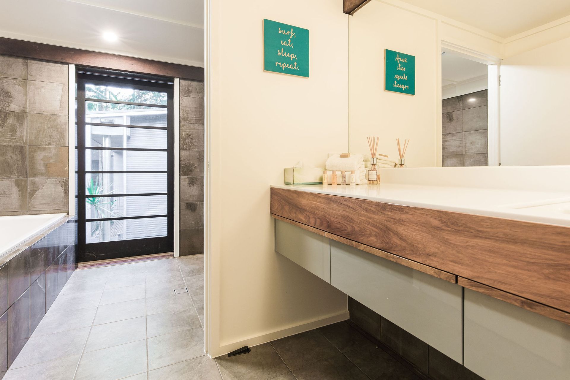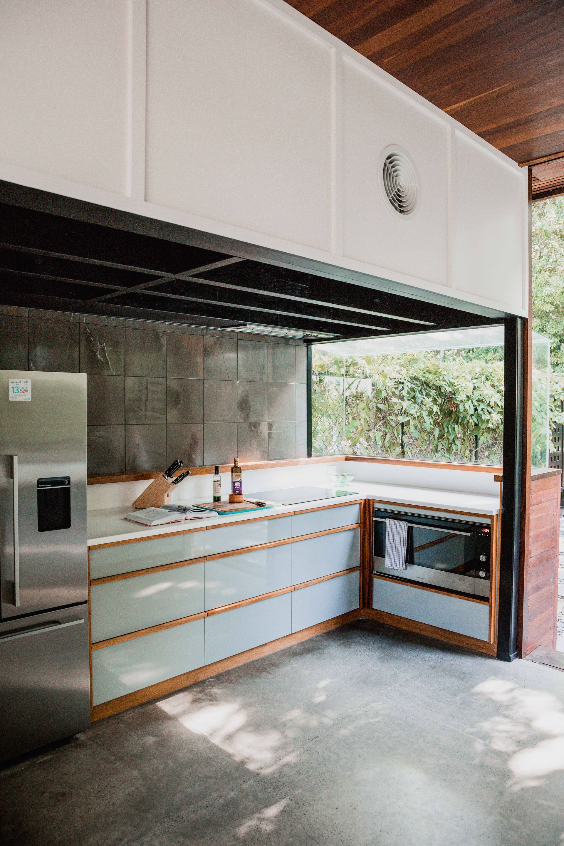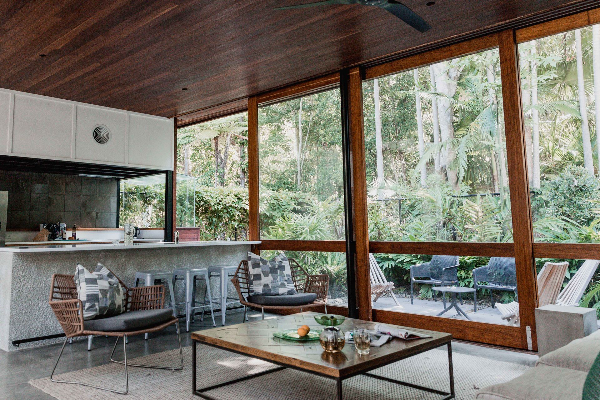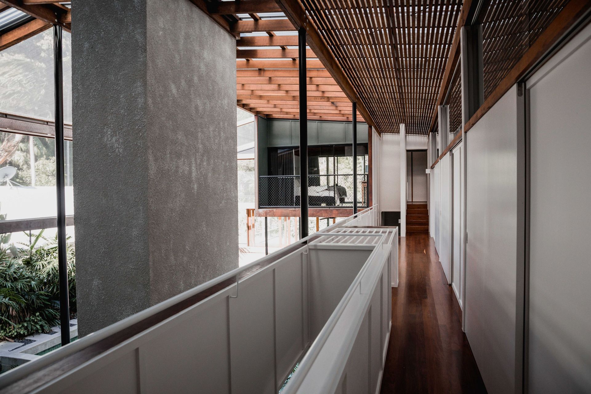 The upstairs walkway is perched above and looks down to the pool, gardens beds, media room and outdoor dining. All living zones and bedrooms open to a mesh screened veranda that wraps around the whole house, creating a one of its kind holiday experience.
