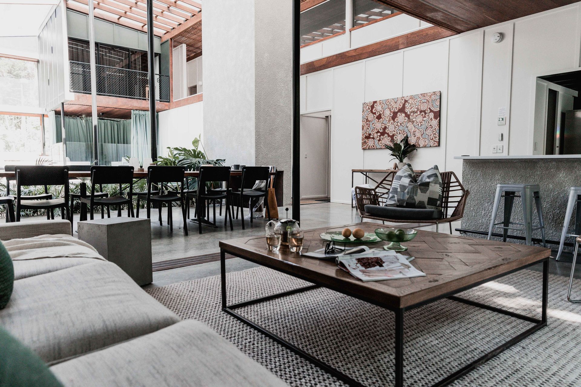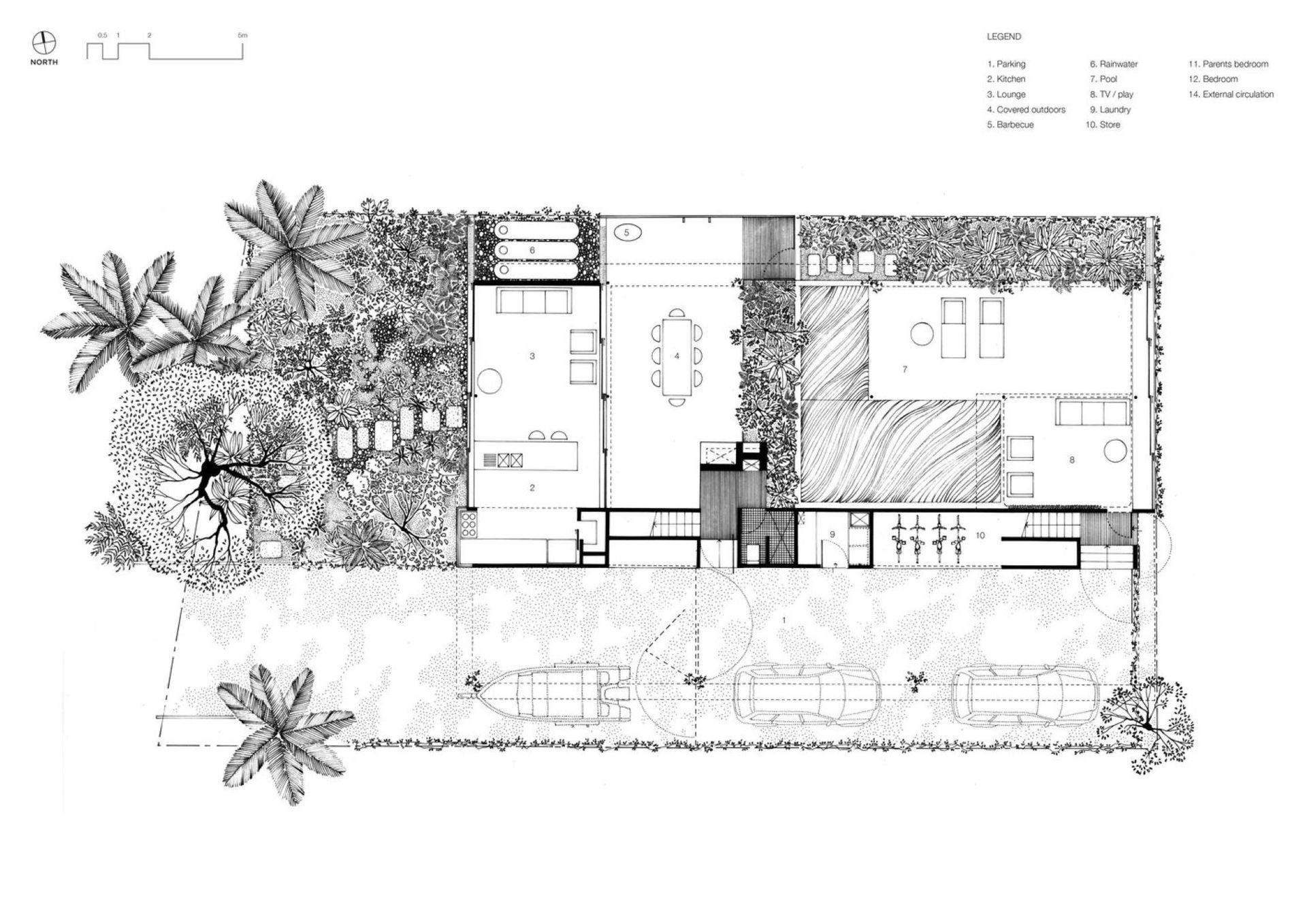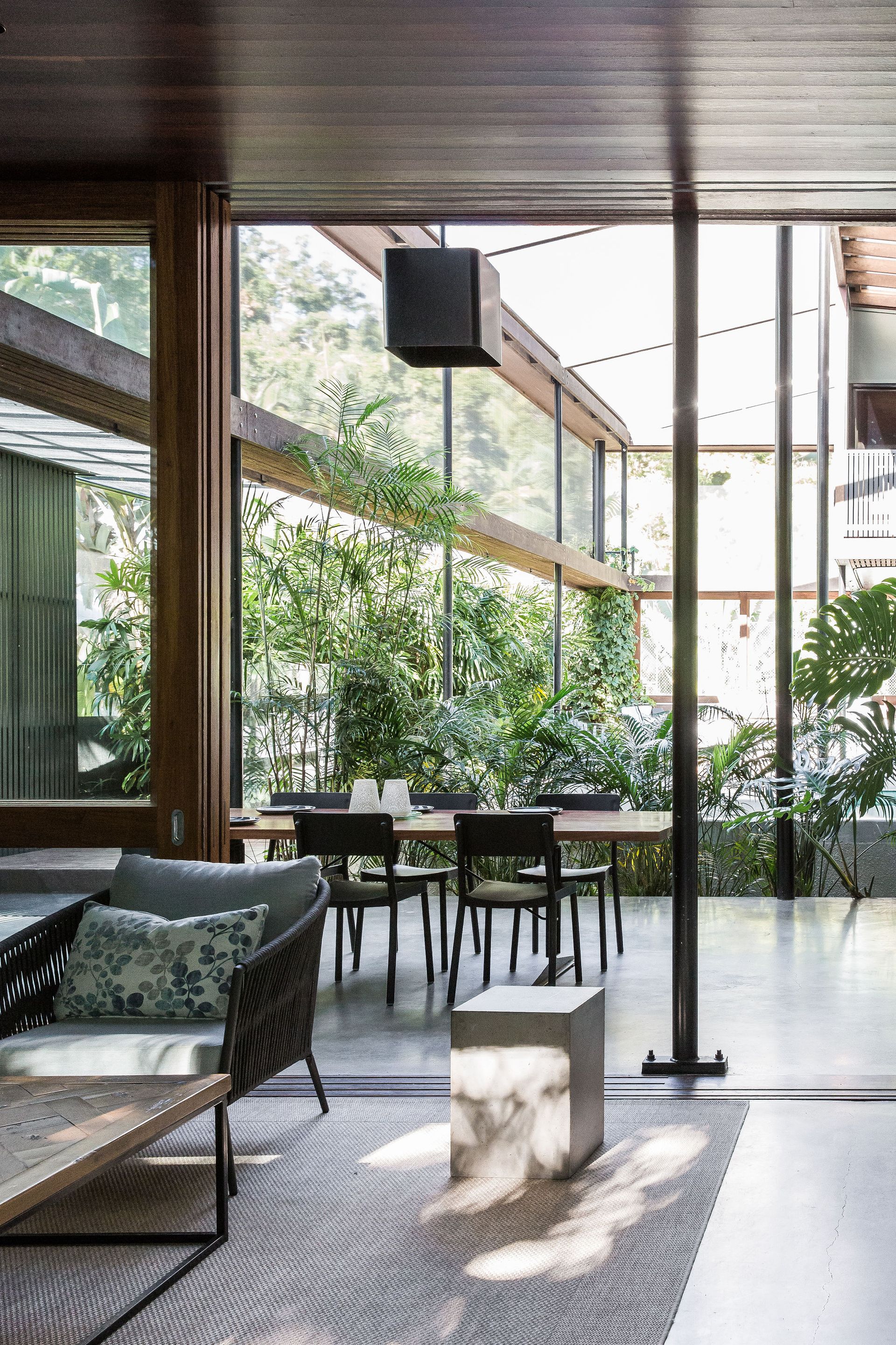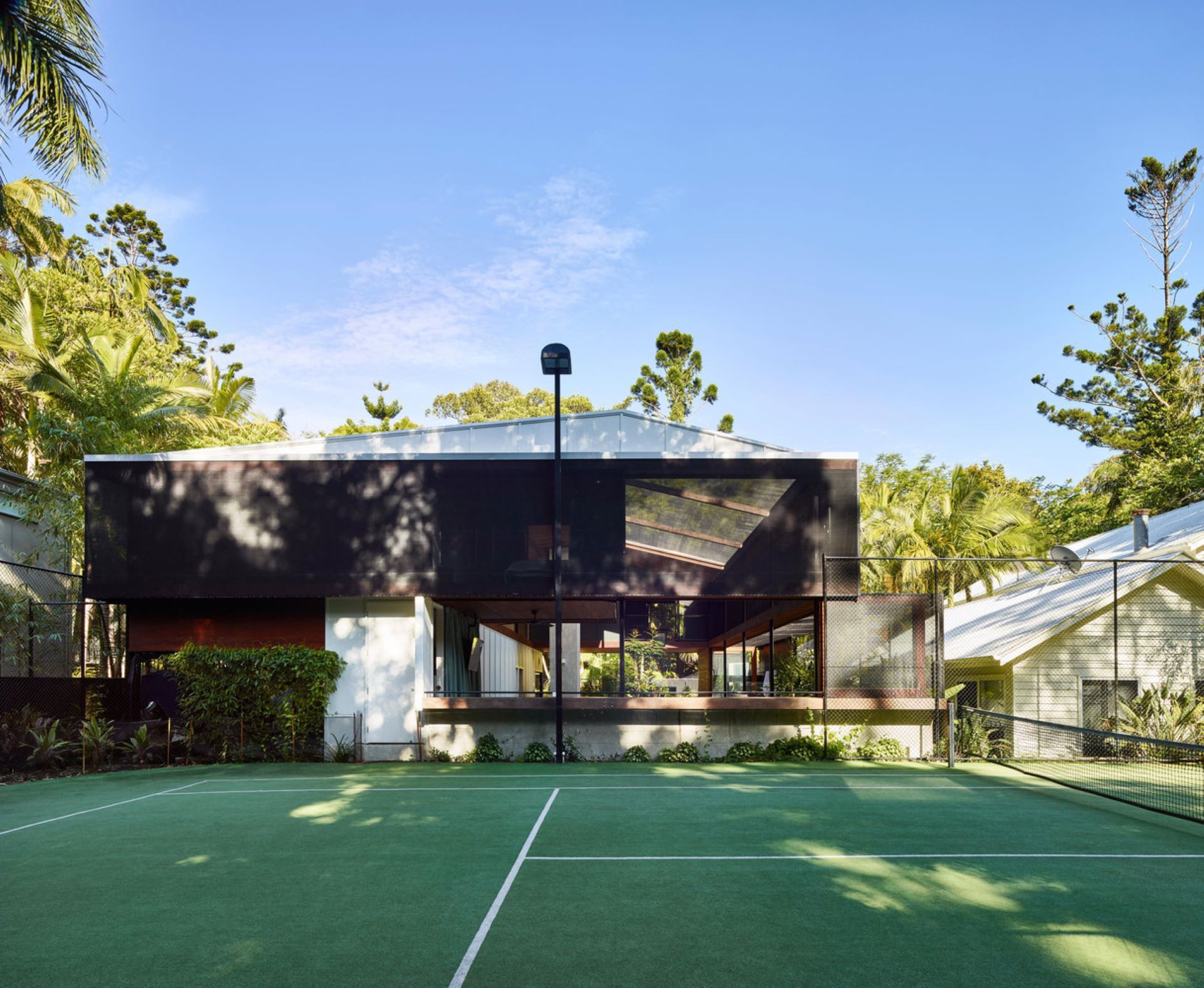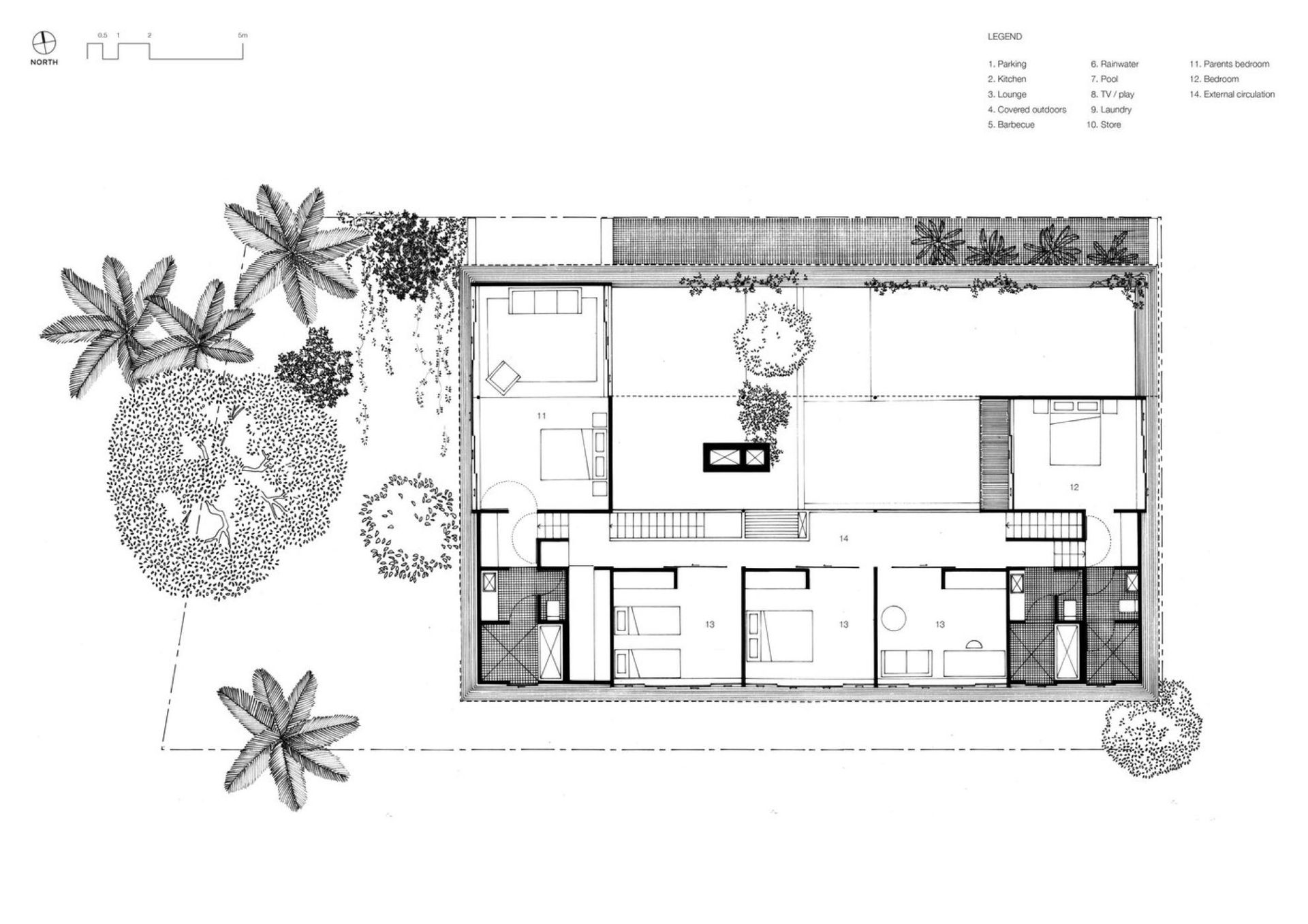 Architects Notes - This holiday home in Noosa offers multi-family accommodation in a spirit reminiscent of camping, with an insect-free central campfire and a pool emulating a tropical forest swimming hole. The project’s architects created a home that is site-sensitive and a climate-responsive design can lead to unexpected and delightful outcomes.