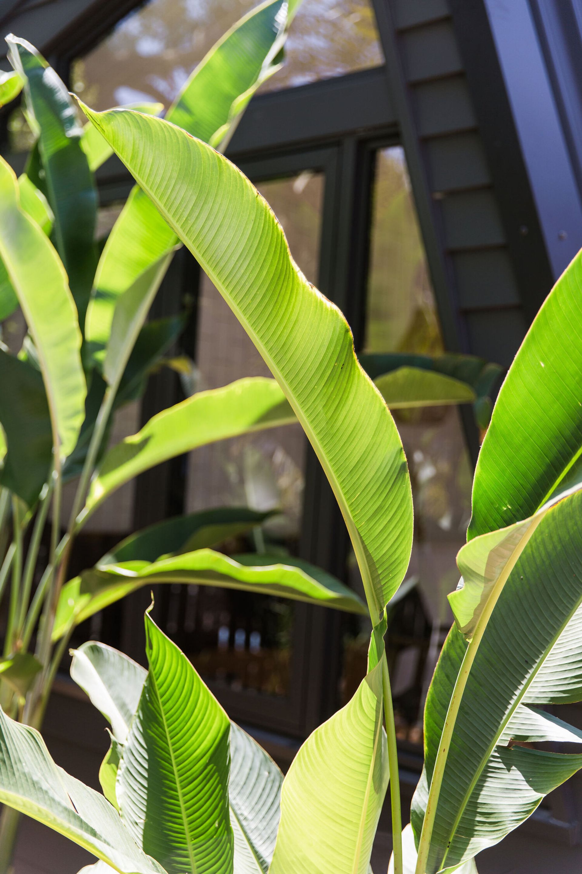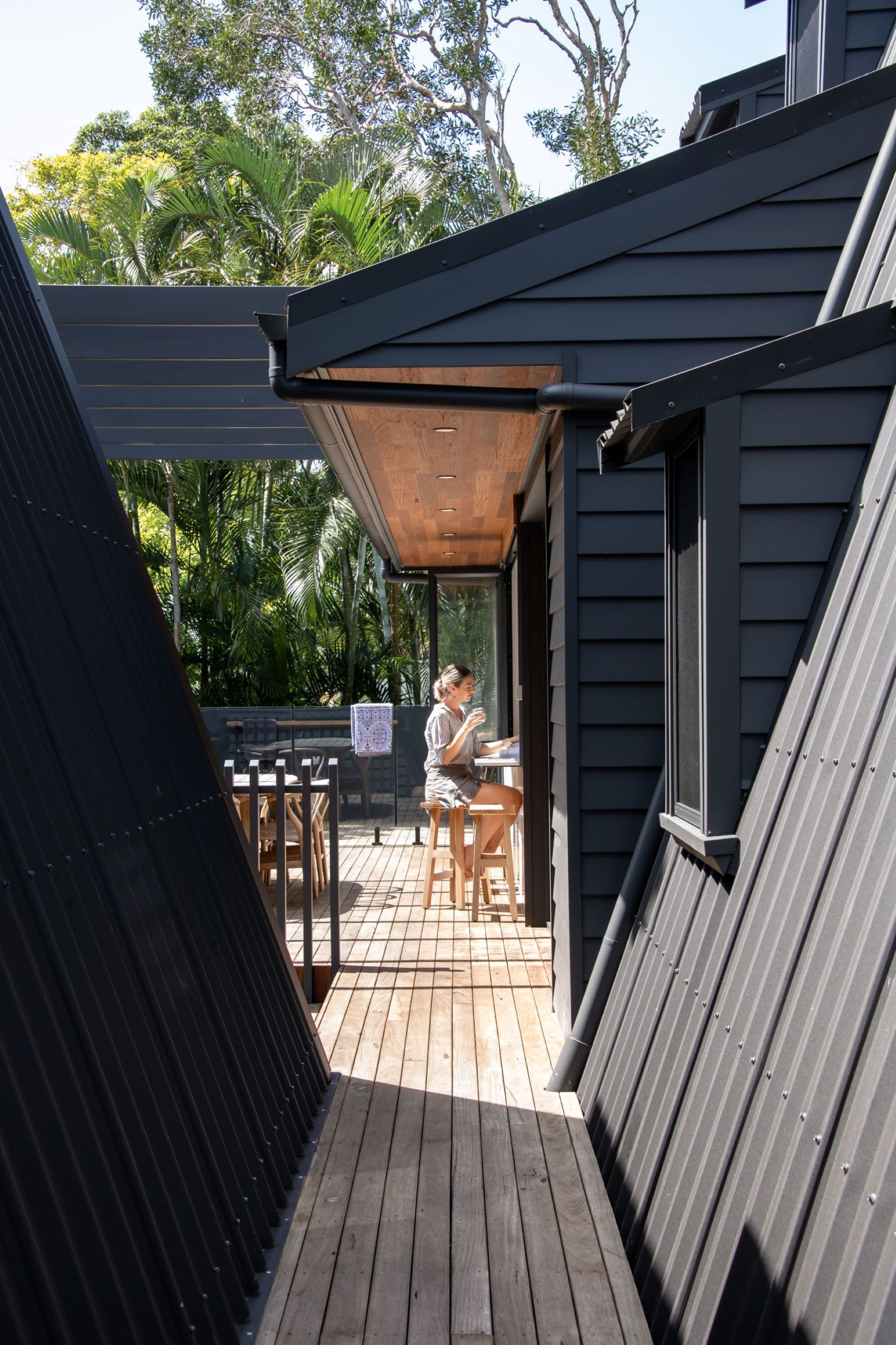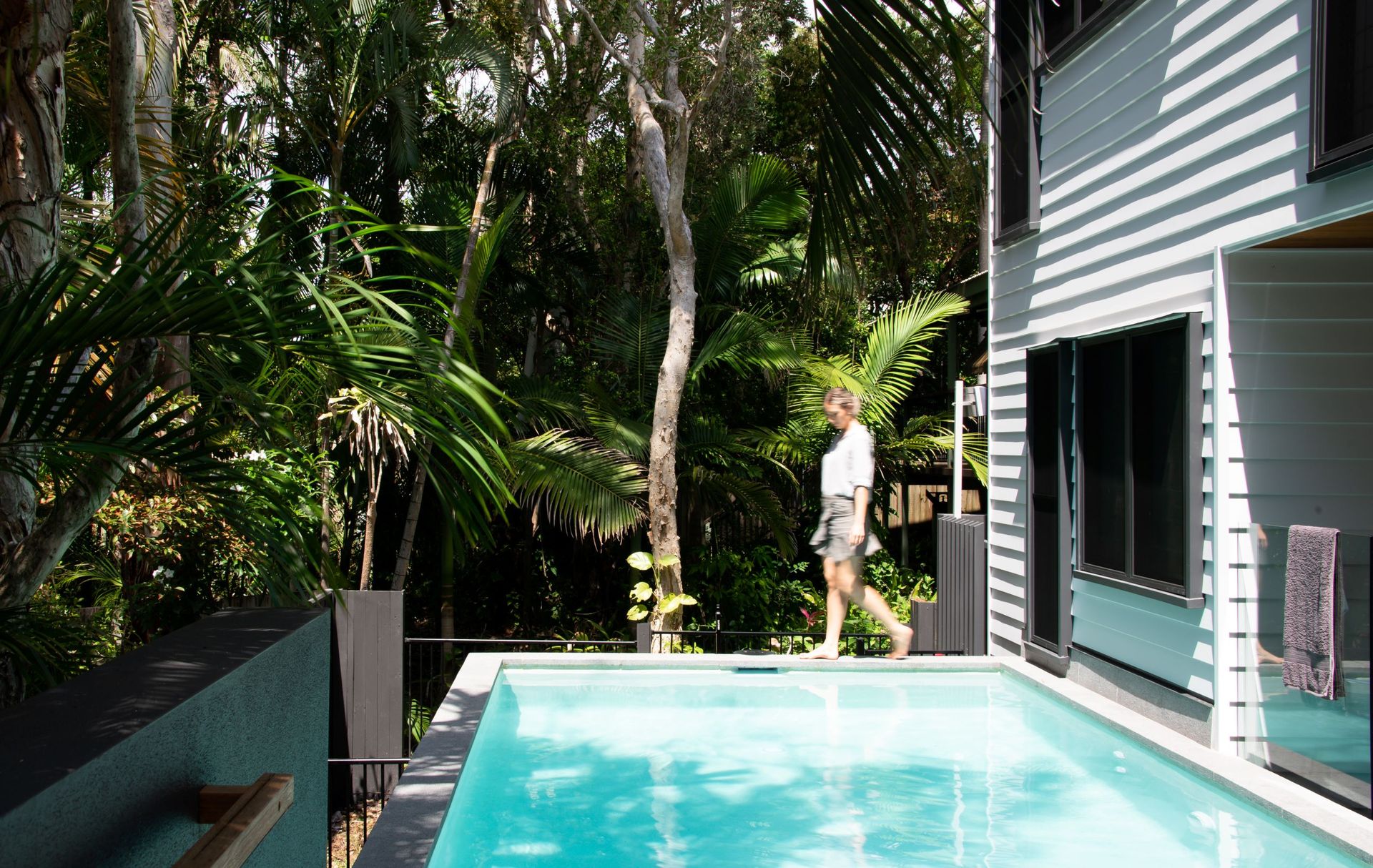 The Sunshine Bungalow opens to the front balcony that leads to the large deck at the back of the property with outdoor dining, BBQ and pool. The pool is copper filtered with fresh water. The space is architecturally designed and nestled amongst the palms and garden.